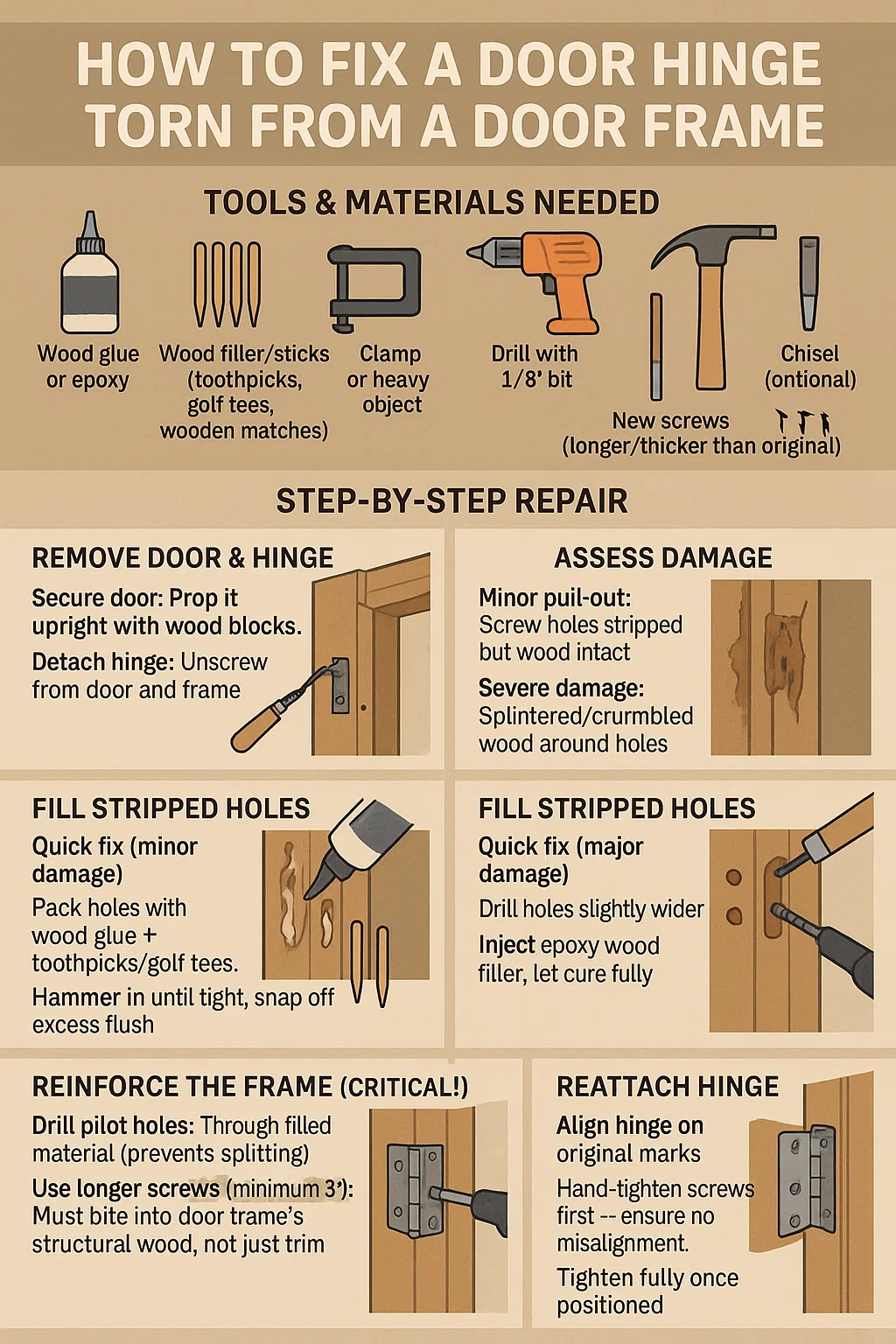 İşte bir sorunu nasıl düzelteceğiniz kapı menteşesi adım adım kapı çerçevesinden koptu: