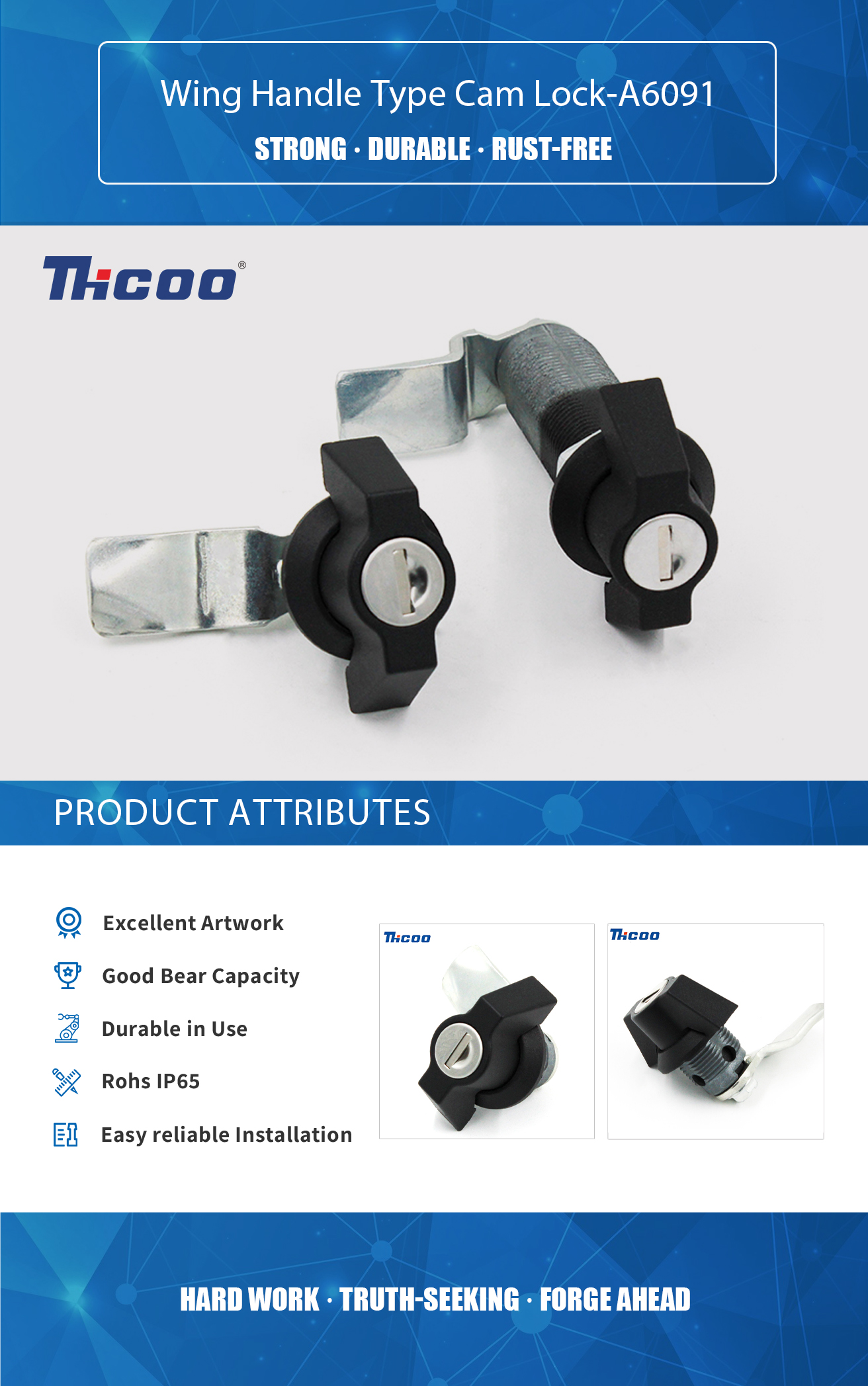 Ürünlerin kalitesini garanti edebilen kendi test laboratuvarımız ve gelişmiş ve eksiksiz denetim ekipmanımız var. Kanat Kulplu Tip Kam Kilidi-A6091, 6 pimli kam ve 3 pimli tamburlu bir kam kilididir. Çeşitli renk kombinasyonlarında mevcuttur ve 1 yıl üretici garantisi ile birlikte gelir.Kol Tipi: Kam Kilidi