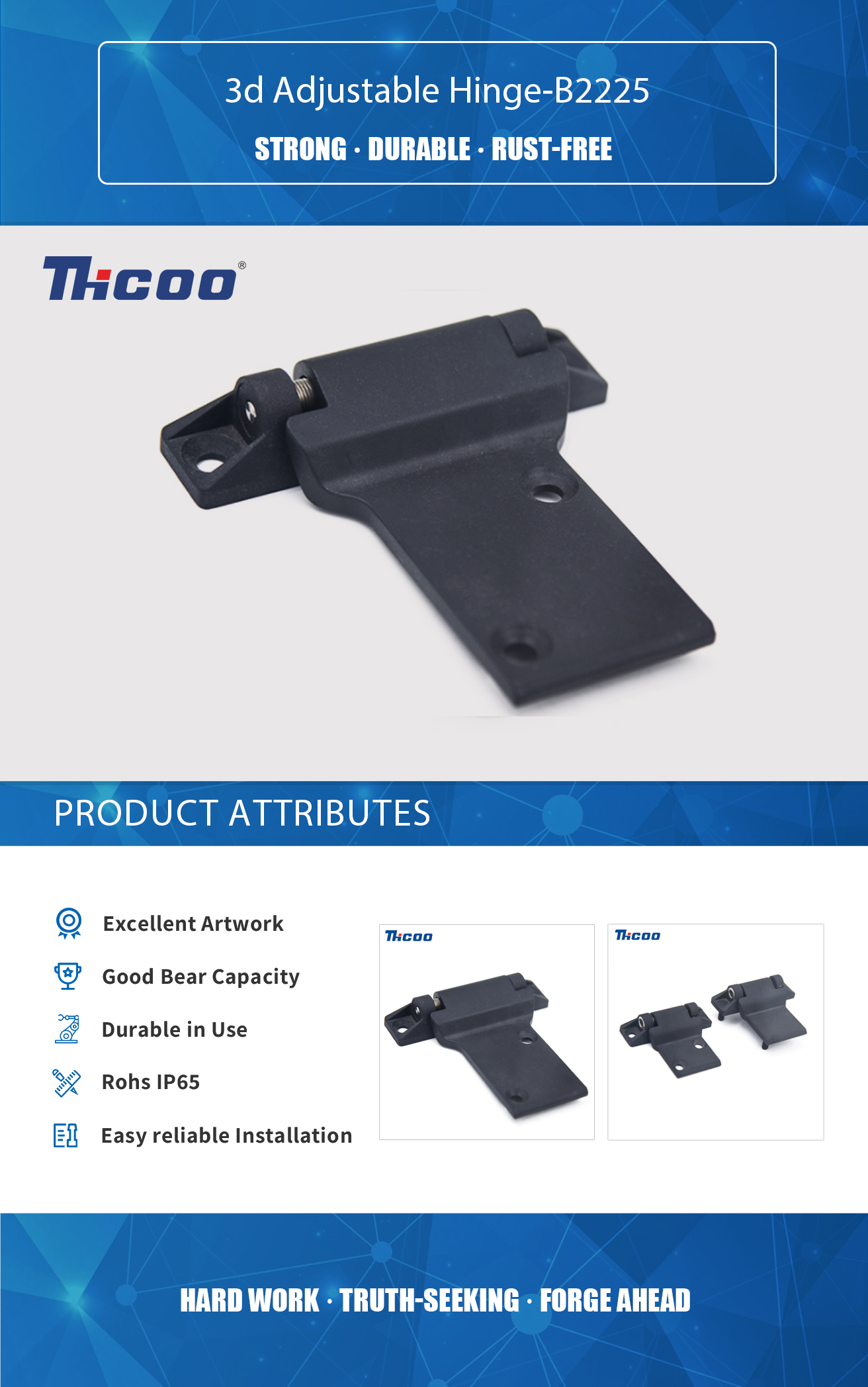 Ürünlerin kalitesini garanti edebilen kendi test laboratuvarımıza ve gelişmiş ve eksiksiz denetim ekipmanına sahibiz.3d Ayarlanabilir Menteşe-B2225  birbirine menteşelenen parçaların üç boyutlu hareketine izin vermek için tasarlanmış bir menteşe türüdür. . Tipik olarak bir parçaya monte edilen bir kanat ve başka bir parçaya monte edilen bir yaprak ve iki kanadı birbirine bağlayan ve parçaların birbirine göre üç boyutlu olarak dönmesini sağlayan bir pimden oluşur.