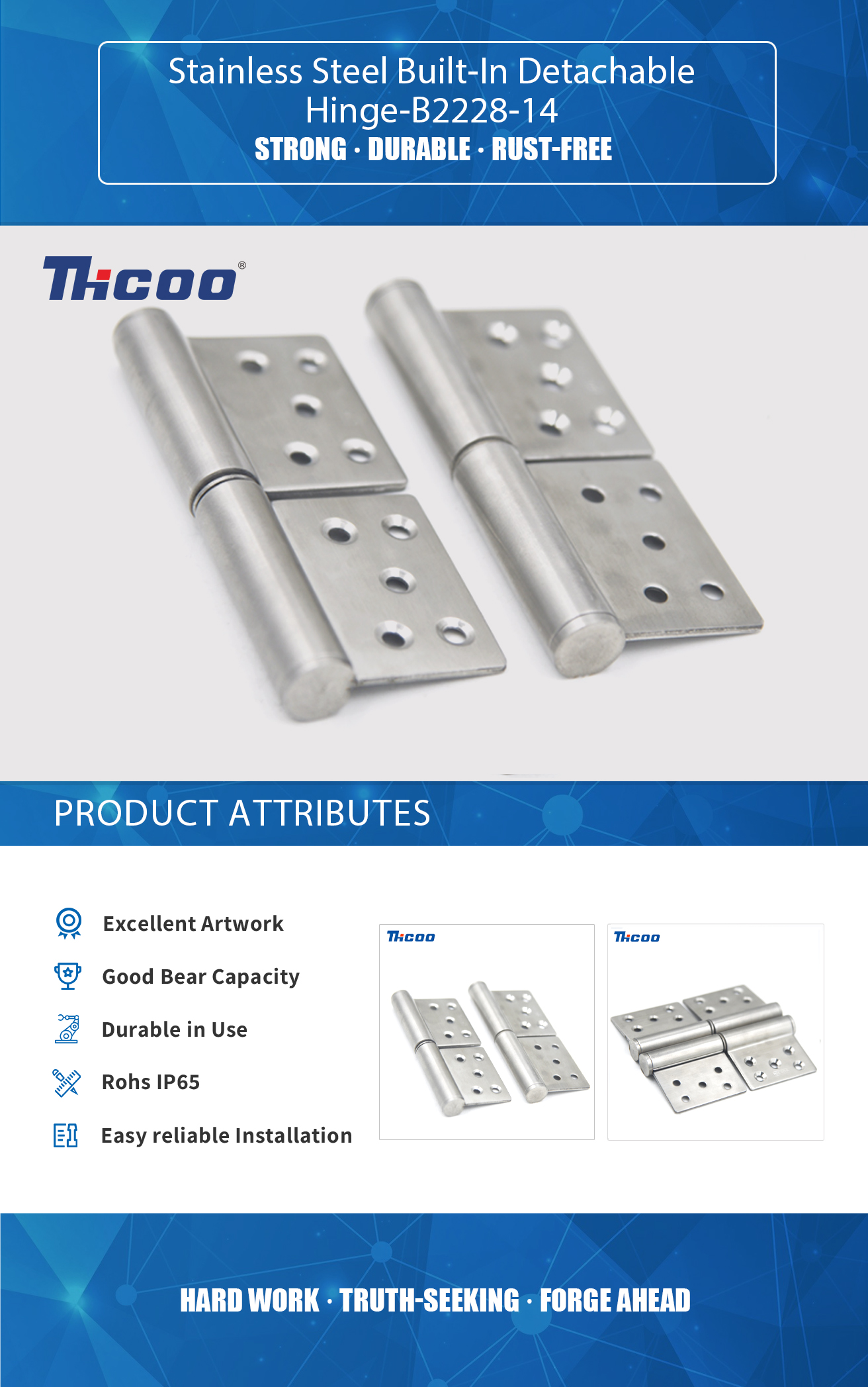 Ürünlerin kalitesini garanti edebilen kendi test laboratuvarımıza ve gelişmiş ve eksiksiz denetim ekipmanına sahibiz. Paslanmaz Çelik Ankastre Ayrılabilir Menteşe-B2228-14'ün kurulumu kolaydır: Paslanmaz çelik yerleşik ayrılabilir menteşeler genellikle minimum araç veya donanım gerektirerek kurulumu kolaydır.