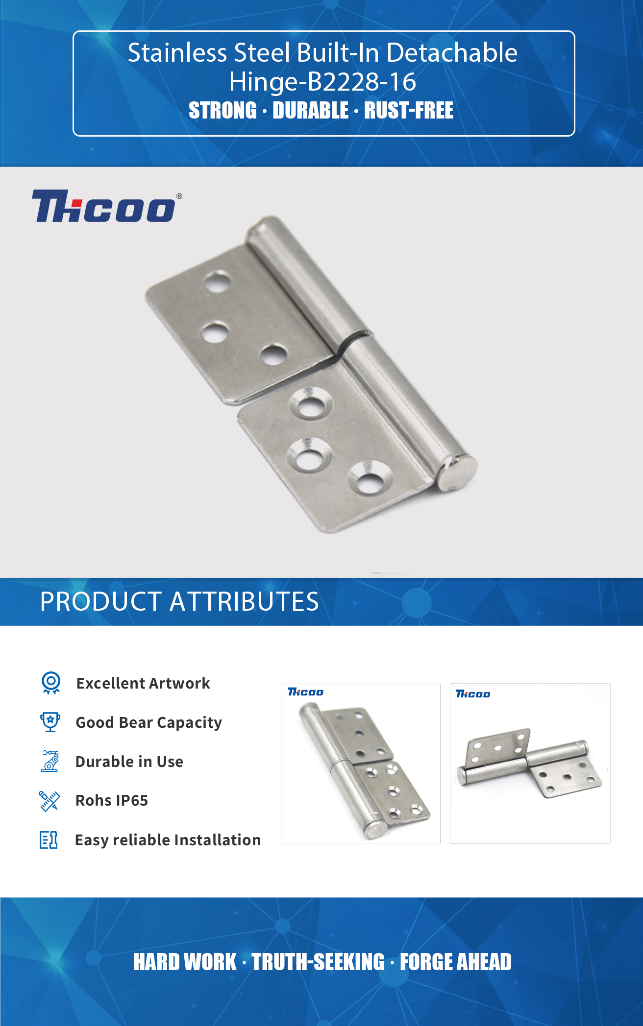 Ürünlerin kalitesini garanti edebilen kendi test laboratuvarımıza ve gelişmiş ve eksiksiz denetim ekipmanına sahibiz. Paslanmaz Çelik Yerleşik Sökülebilir Menteşe Radyal yük 500N'dir. Bu tip menteşe, 500N'a kadar bir yükü desteklemek üzere tasarlanmıştır. kullanımda.