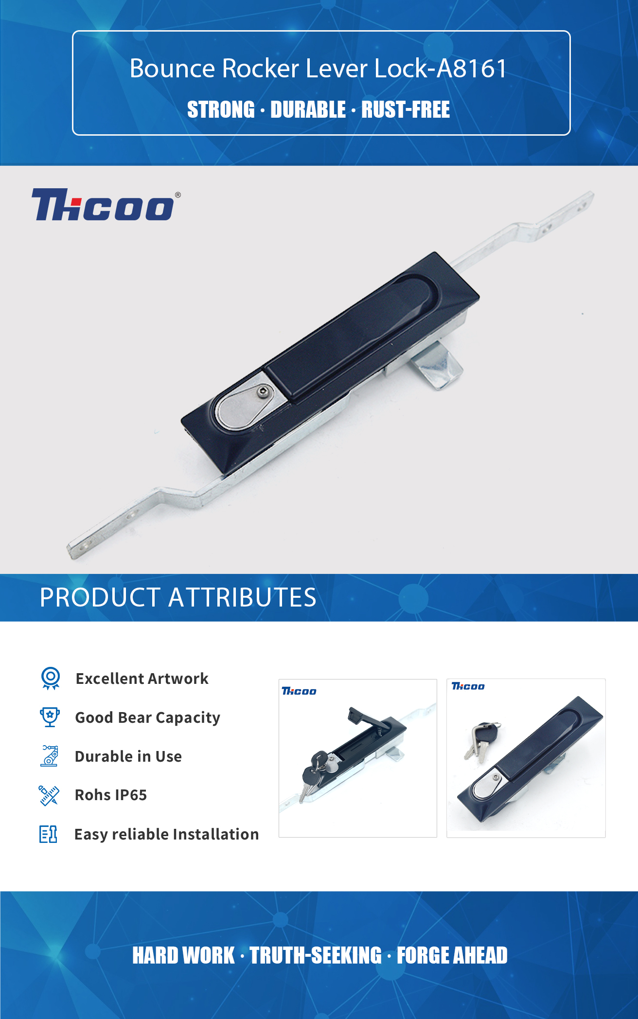 Ürünlerin kalitesini garanti edebilen kendi test laboratuvarımıza ve gelişmiş ve eksiksiz denetim ekipmanına sahibiz. Bounce Rocker Lever Lock-A8161, bir kapıyı sabitlemek için bir rocker kolu mekanizması ve yaylı bir mandal kullanan bir kilit türüdür. veya diğer cihaz. Mekanizmanın kilidini açmak ve kapının açılmasını sağlamak için külbütör kolu bir anahtar veya başka bir aletle hareket ettirilir. Yaylı mandal, kapı kapatıldığında yerine geri döner ve kapının güvenli bir şekilde kilitli kalmasına yardımcı olur.